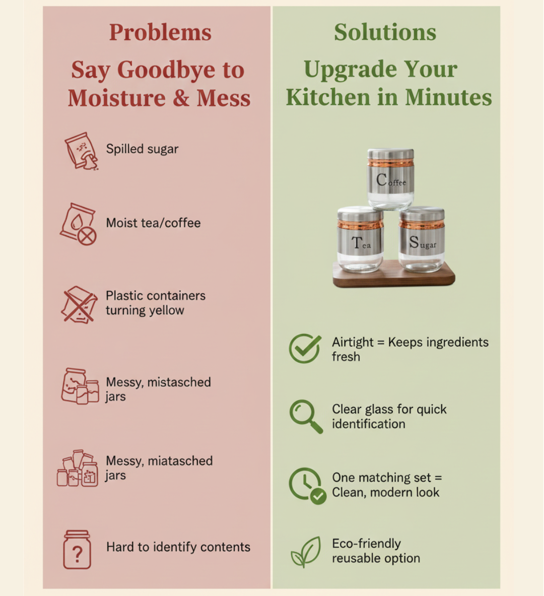 Perfectly sized for everyday use, this set keeps your essentials within reach and neatly organized, enhancing your kitchen’s functionality without compromising on style. Whether you’re brewing a cup of coffee in the morning or enjoying a hot tea in the afternoon, these jars are an elegant way to store and display your favorite ingredients. Durable, versatile, and easy to clean, the Stainless Steel Tea Coffee Sugar Glass Jar Set is the perfect blend of form and function.
